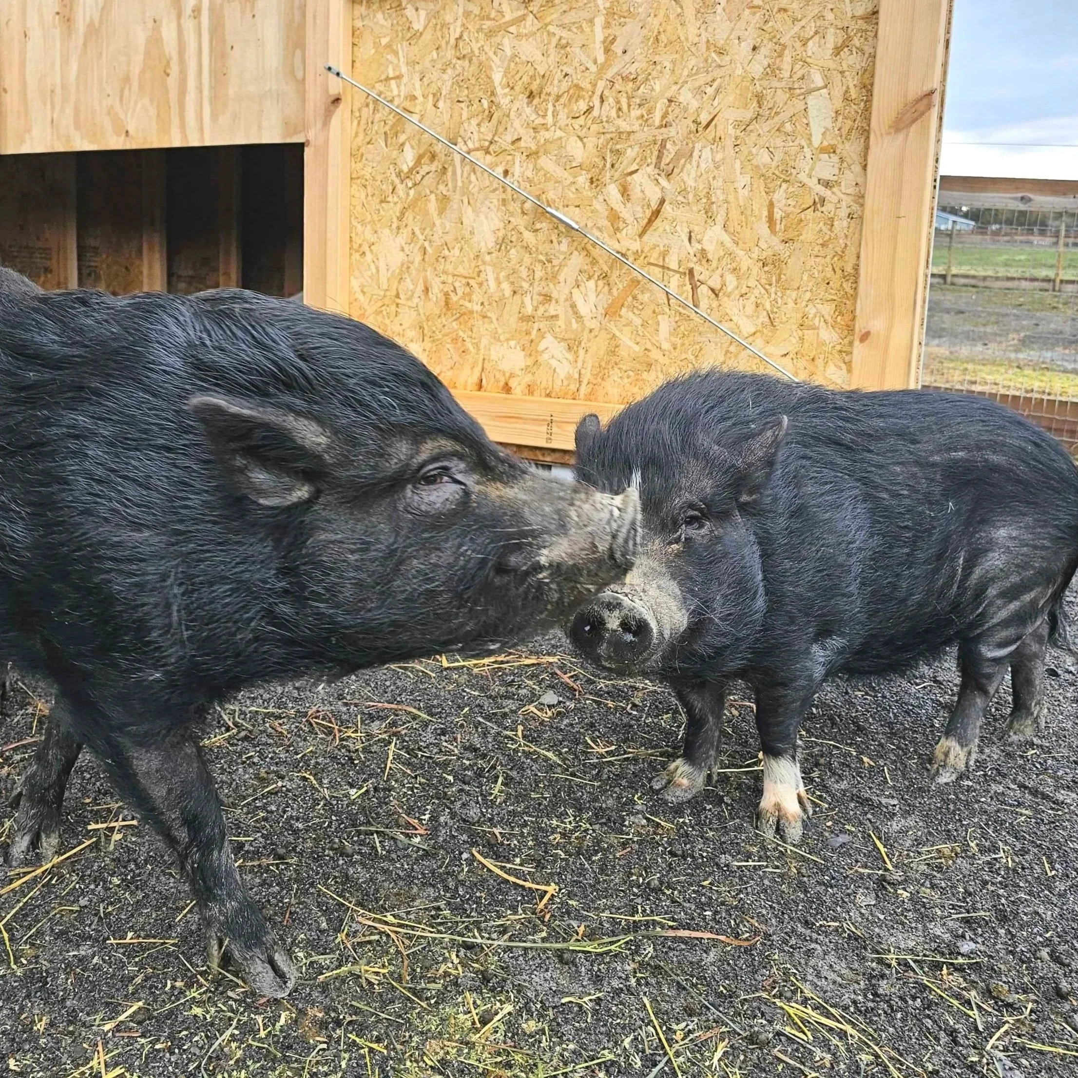 These little Vietnamese potbellies were both surrendered to shelters when they were young…just like approximately 90% of pet pigs. At just 75 lbs., these boys are about as small as pigs get. Most potbellies are about 100-250 lbs., and few people are prepared for how smart, demanding, and large they get. (There is no such thing as minipigs or teacup pigs.)
