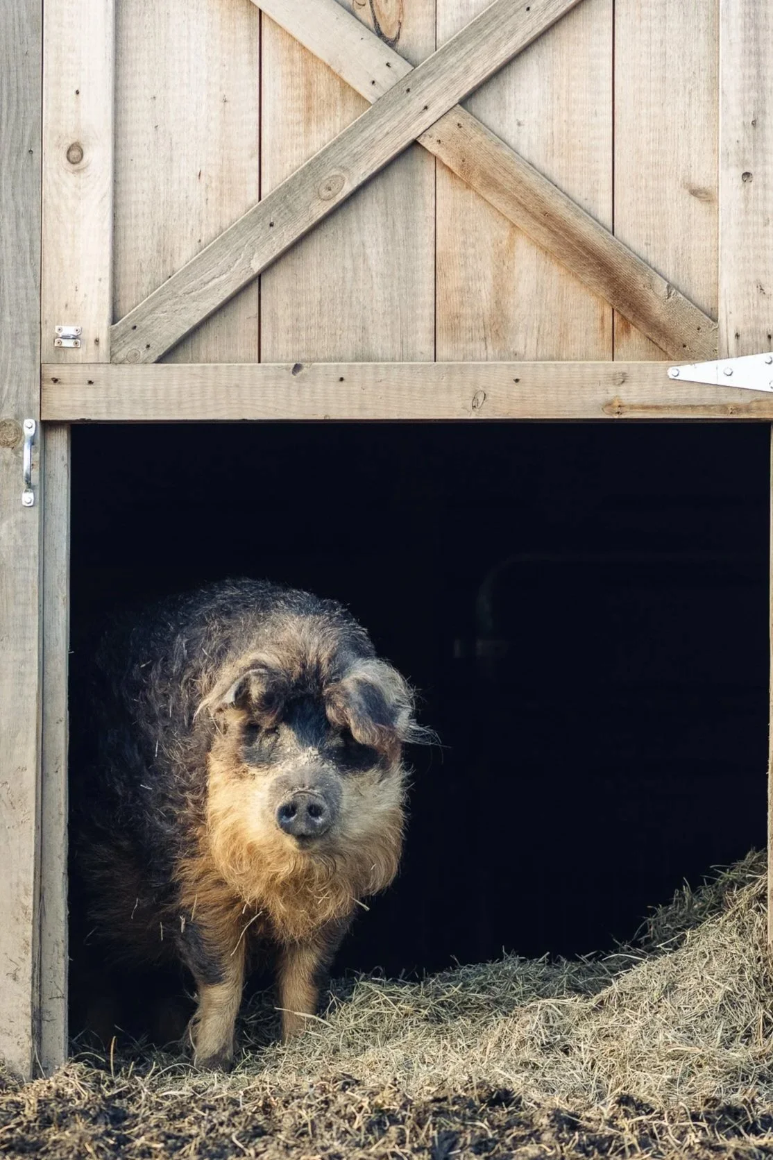 Piggy Sue and Piggy Smalls found a home at Sweet Farm when the pigs helped close a backyard breeding location a few hours south of Sweet Farm. A young man wanted to raise 12 mangalitsas in his backyard to be sold later for slaughter. However, after noticing how similar their personalities were to their beloved dogs, and just how smart and loving they were, his family quickly fell in love with the piglets. They soon were able to convince the father of the family to not slaughter them.