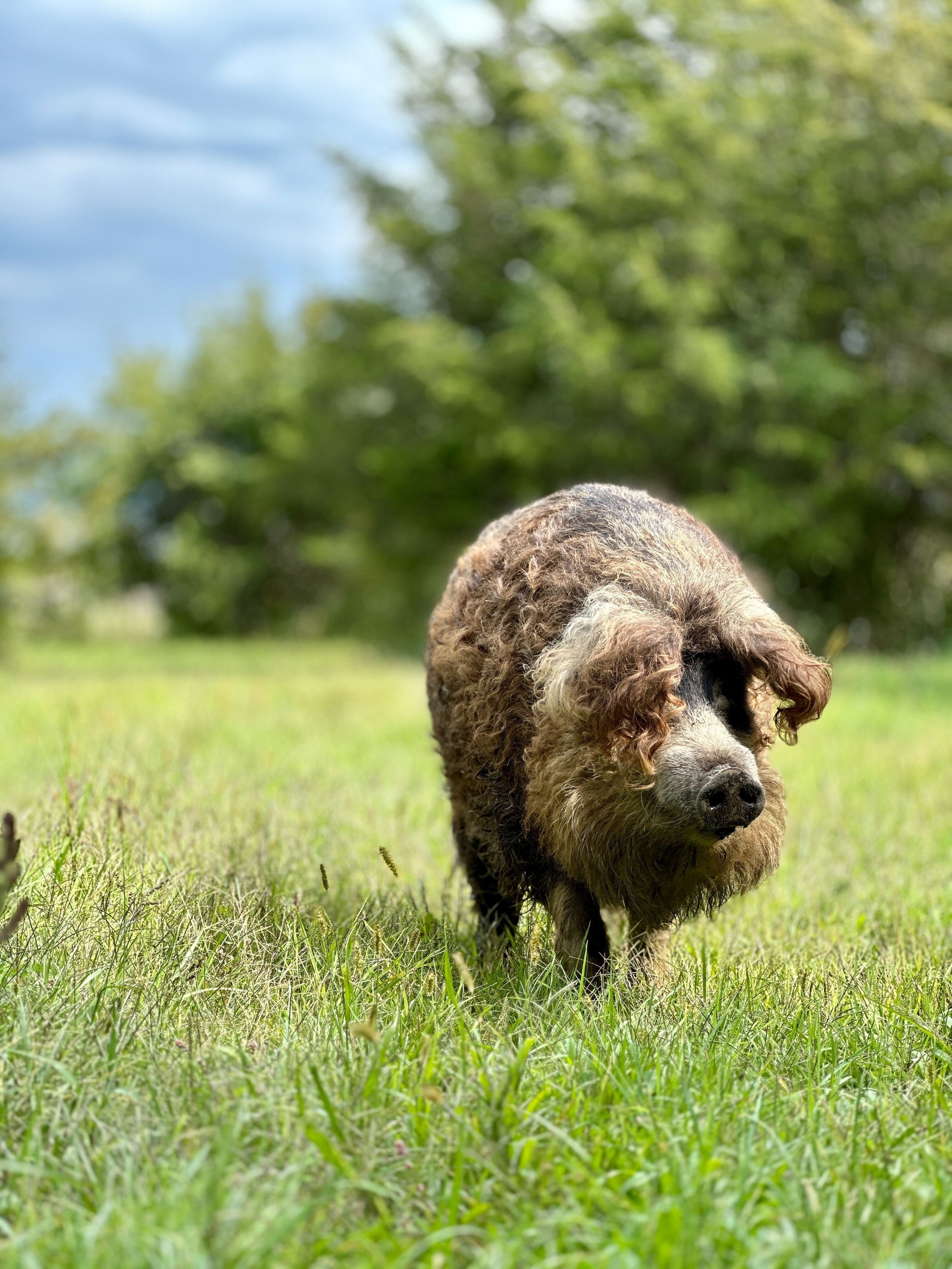 The family also realized how over their heads they were in needing to find homes for their newfound pets. They reached out to Sweet Farm for help. We assisted in finding forever homes for all 12 mangalitsas, also known as Hungarian Wooly pigs, and were able to keep Piggy Sue and Piggy Smalls to live out their forever lives in our pastures. They now spend their days roaming the woods, mud bathing, and rooting around with their numerous pig friends.