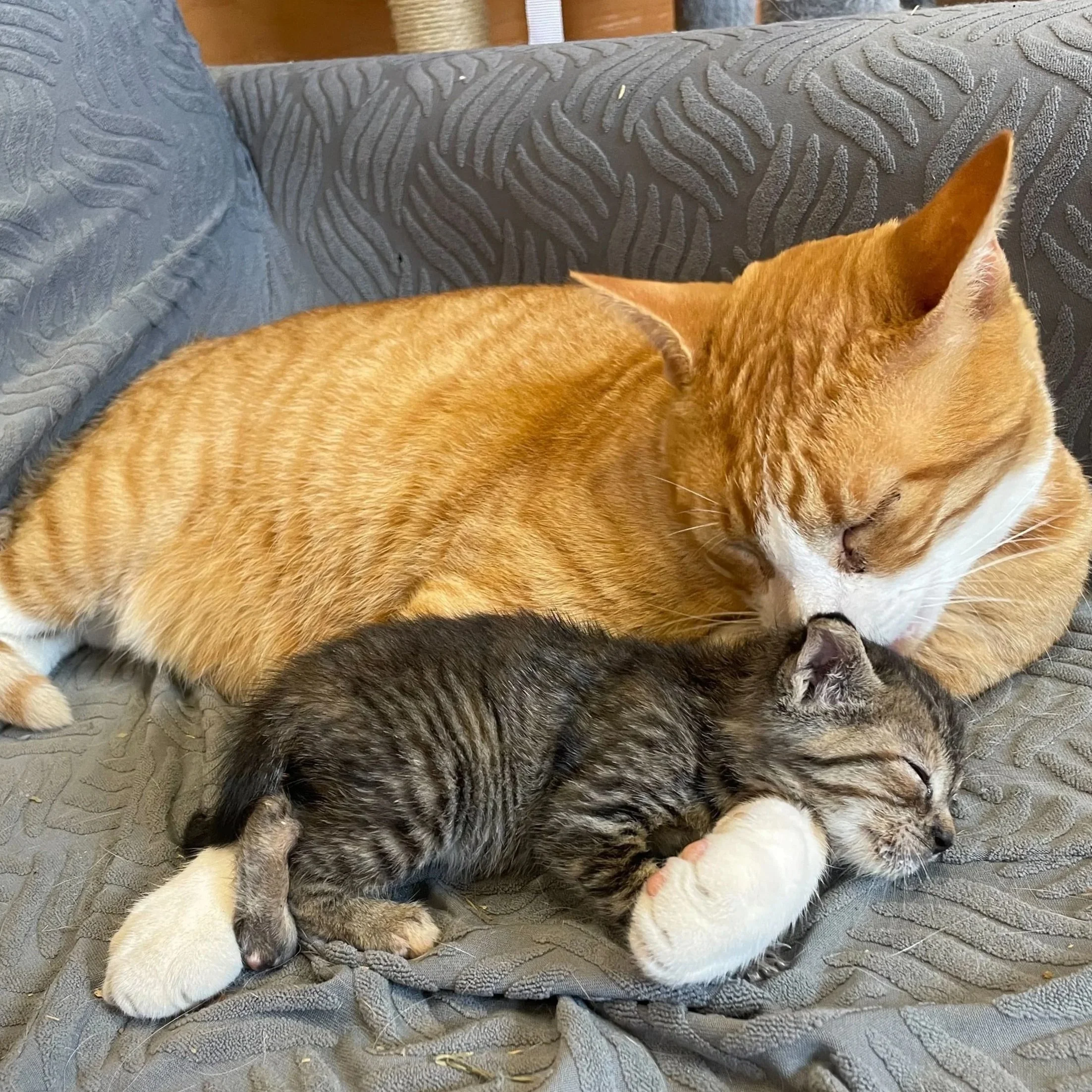 We were asked to foster a neonatal kitten that was found all alone on a local farm. She was super tiny and needed to be bottle fed every few hours, which meant she had to be near a team member at all times. Well, our big orange softie, Monster (above), fell in love with her.